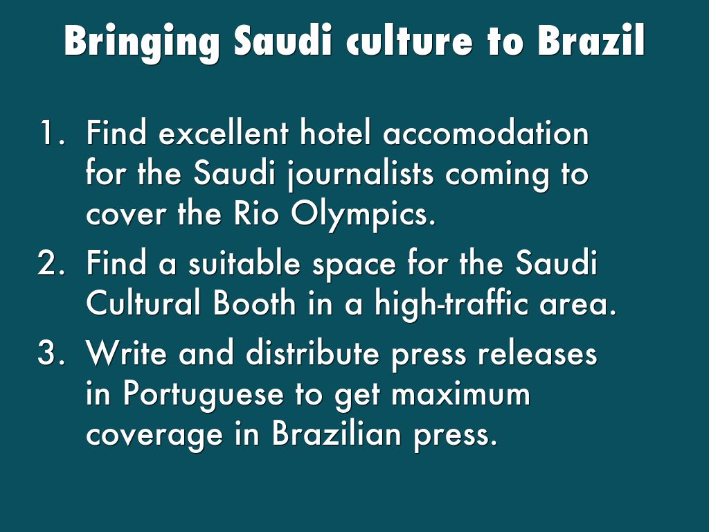 - Find excellent hotel accomodation for the Saudi journalists coming to cover the Rio Olympics.