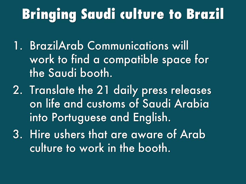 - BrazilArab Communications will work to find a compatible space for the Saudi booth.