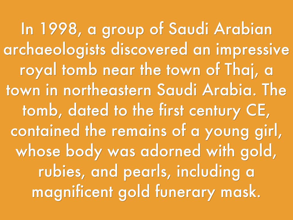 In 1998, a group of Saudi Arabian archaeologists discovered an impressive royal tomb near the town of Thaj, a town in northeastern Saudi Arabia. The tomb, dated to the first century CE, contained the remains of a young girl, whose body was adorned with gold, rubies, and pearls, including a magnificent gold funerary mask.