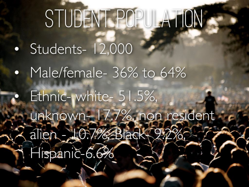 Ethnic- white- 51.5%, unknown- 17.7%, non resident alien - 10.7%, Black- 9.2%, Hispanic-6.6%