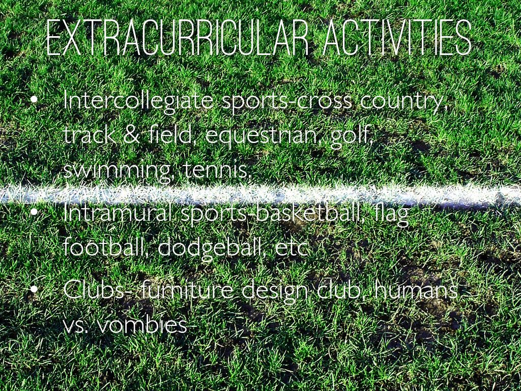 Intercollegiate sports-cross country, track & field, equestrian, golf, swimming, tennis.