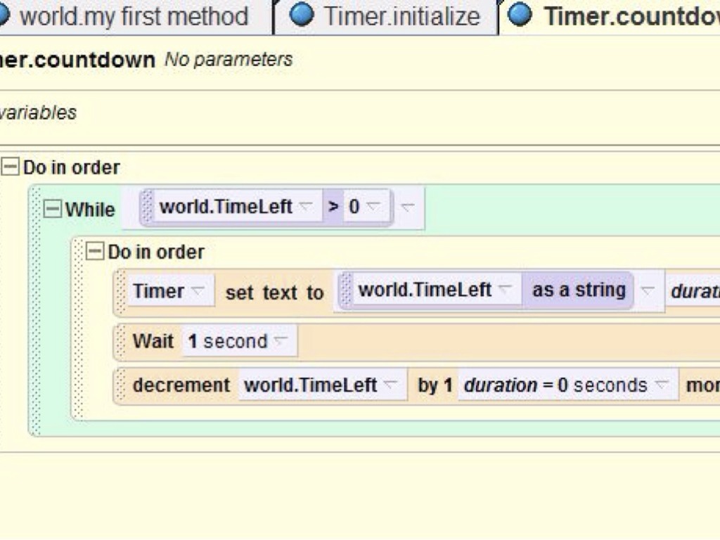 The countdown method uses the variable in "initialize" and displays it as 3d text. It then waits one second and decreases the variable by 1 in result, creates a timer in the game.