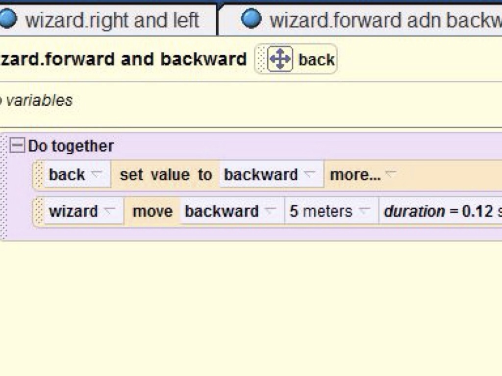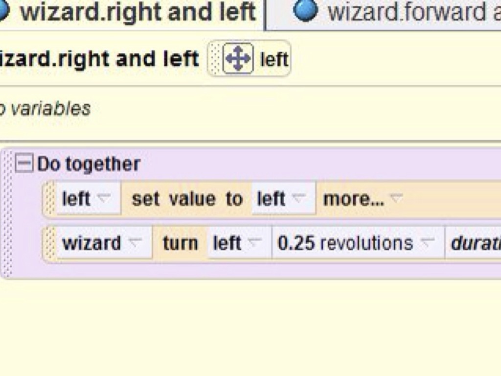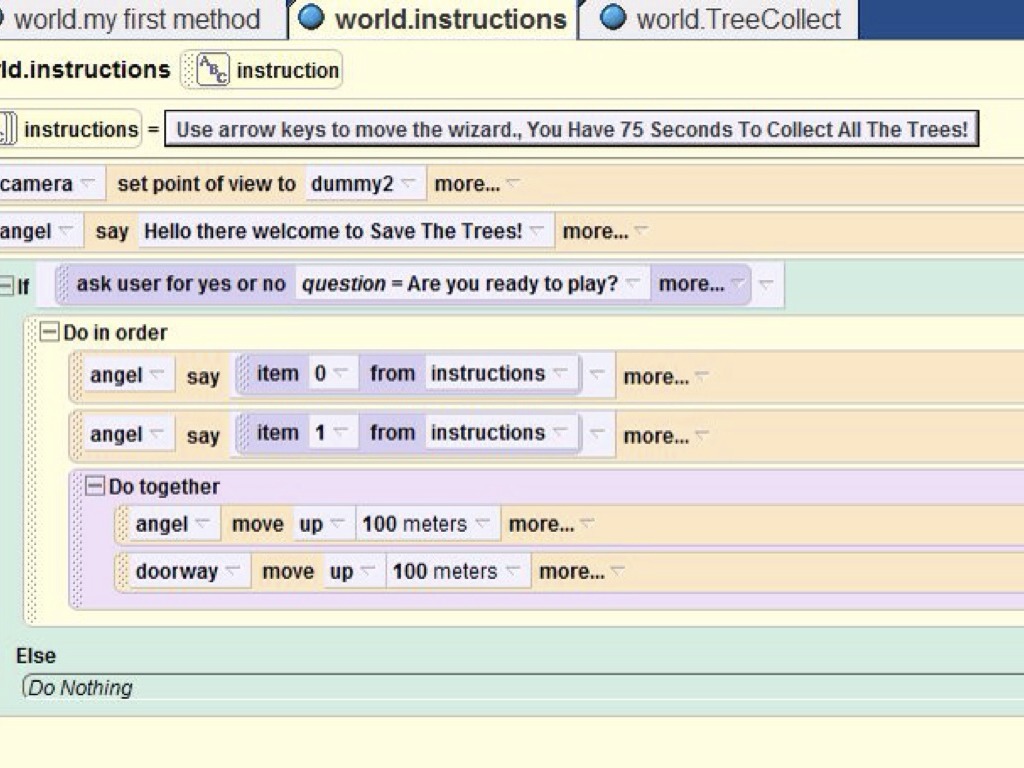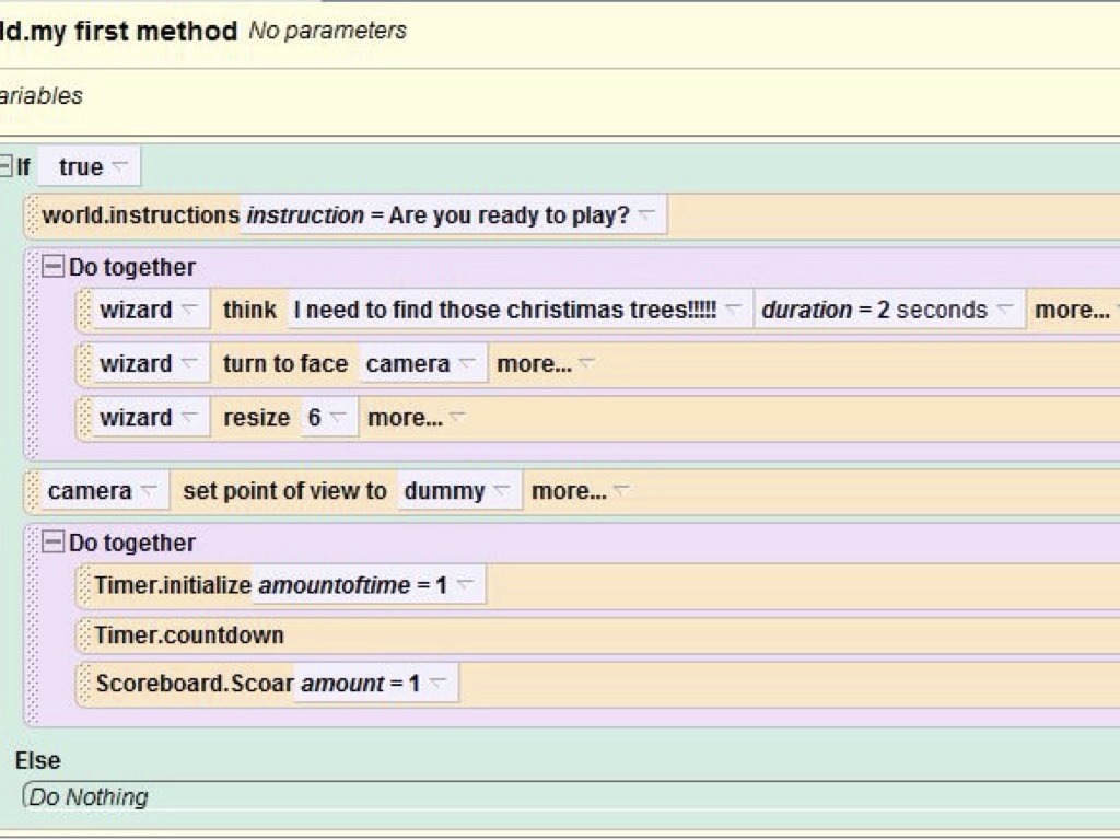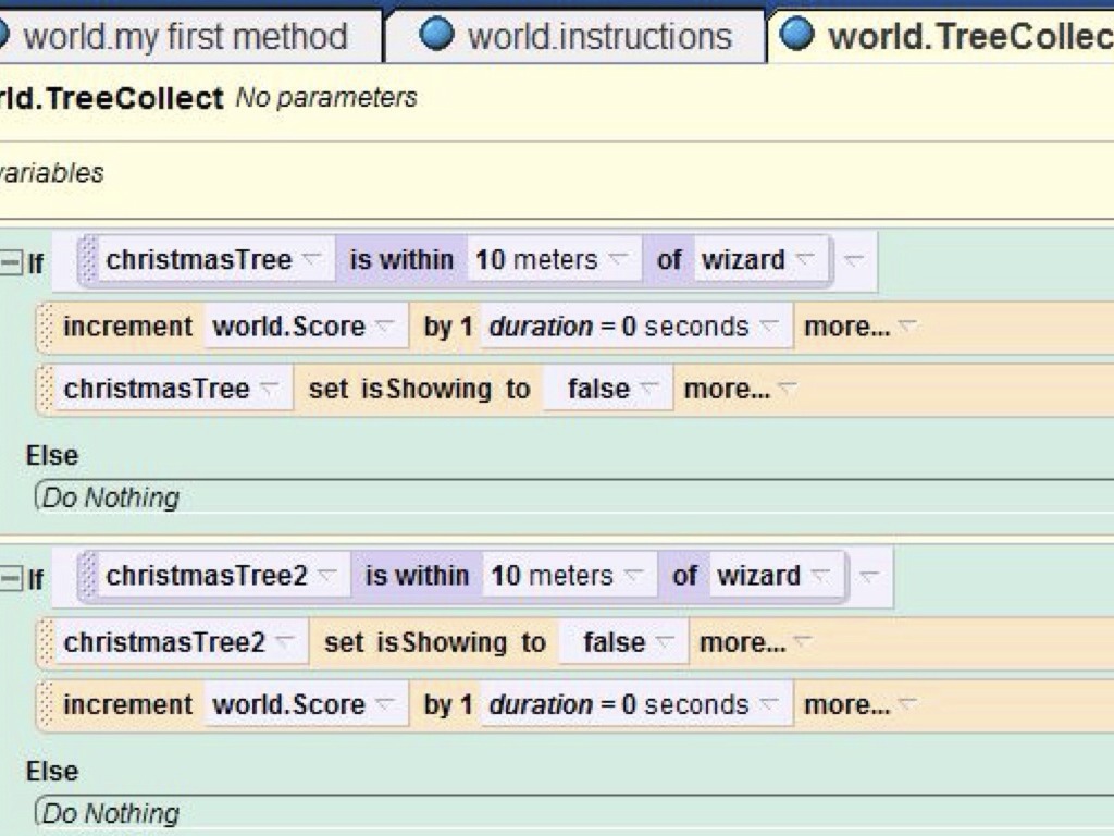 TreeCollect uses the same code for each tree. It allows the wizard to "pick up" a tree and collect it. When a tree is collected it no longer shows. TreeCollect is called by an event rather than "myfirstmethod" because it must be active at all times when the wizard is moving.