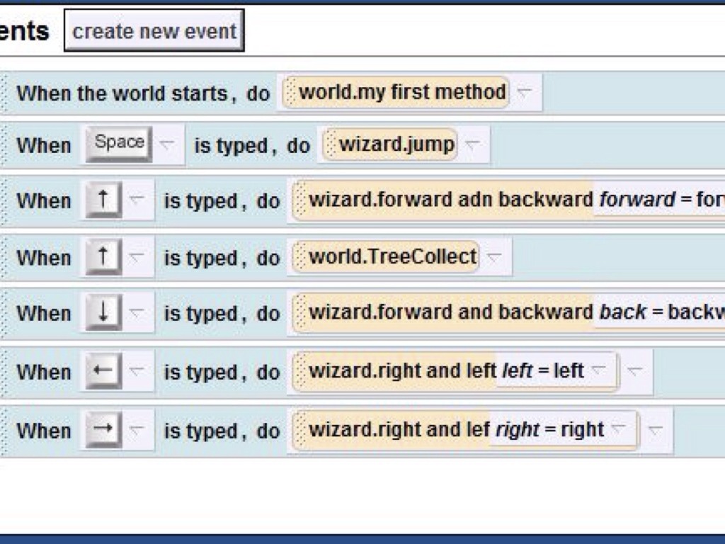 The events are used to call methods. The events section in our program is used to call "my first method" which is the main method, and it also allows movements to be controlled with the arrow keys and for trees to be collected.