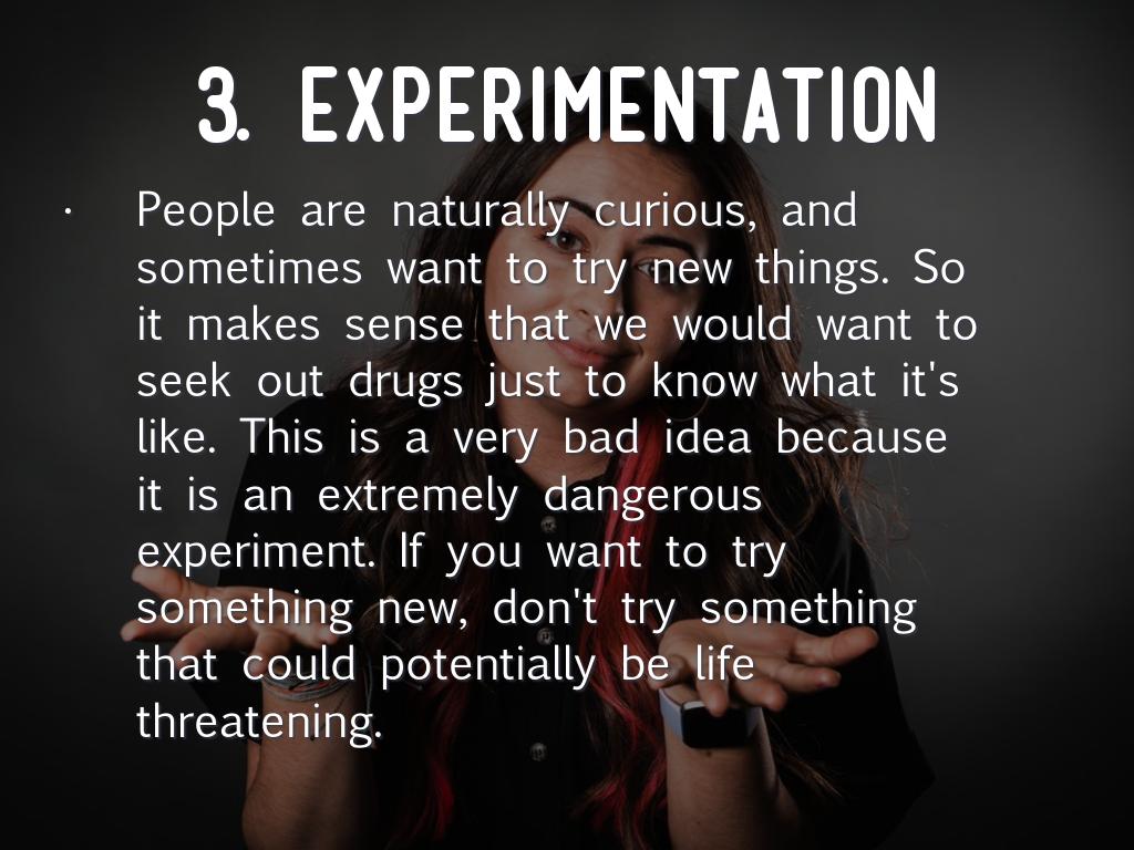 People are naturally curious, and sometimes want to try new things. So it makes sense that we would want to seek out drugs just to know what it's like. This is a very bad idea because it is an extremely dangerous experiment. If you want to try something new, don't try something that could potentially be life threatening.