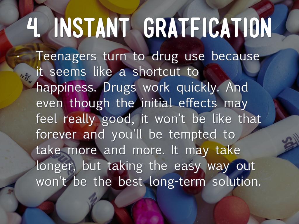 Teenagers turn to drug use because it seems like a shortcut to happiness. Drugs work quickly. And even though the initial effects may feel really good, it won't be like that forever and you'll be tempted to take more and more. It may take longer, but taking the easy way out won't be the best long-term solution.