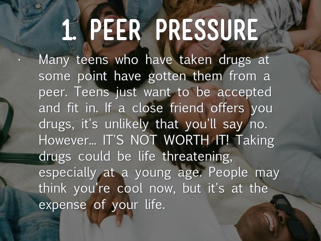 Many teens who have taken drugs at some point have gotten them from a peer. Teens just want to be accepted and fit in. If a close friend offers you drugs, it's unlikely that you'll say no. However... IT'S NOT WORTH IT! Taking drugs could be life threatening, especially at a young age. People may think you're cool now, but it's at the expense of your life.