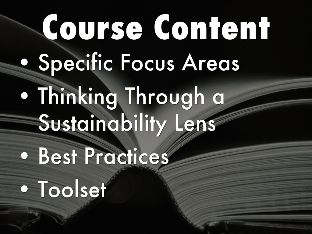 Course content will have a practical focus. Application areas can include energy efficiency, water conservation, waste management, supply chain management, lower CO2 emissions, etc.