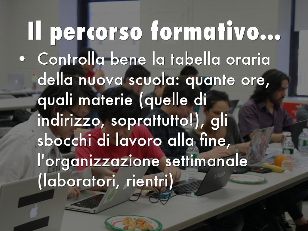 Controlla bene la tabella oraria della nuova scuola: quante ore, quali materie (quelle di indirizzo, soprattutto!), gli sbocchi di lavoro alla fine, l'organizzazione settimanale (laboratori, rientri)