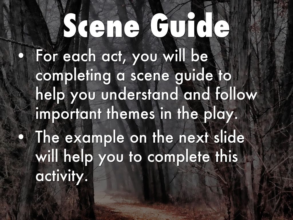 For each act, you will be completing a scene guide to help you understand and follow important themes in the play.