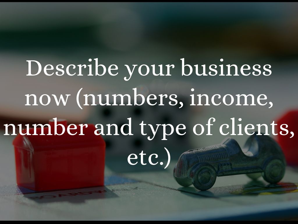 Describe your business now (numbers, income, number and type of clients, etc.)