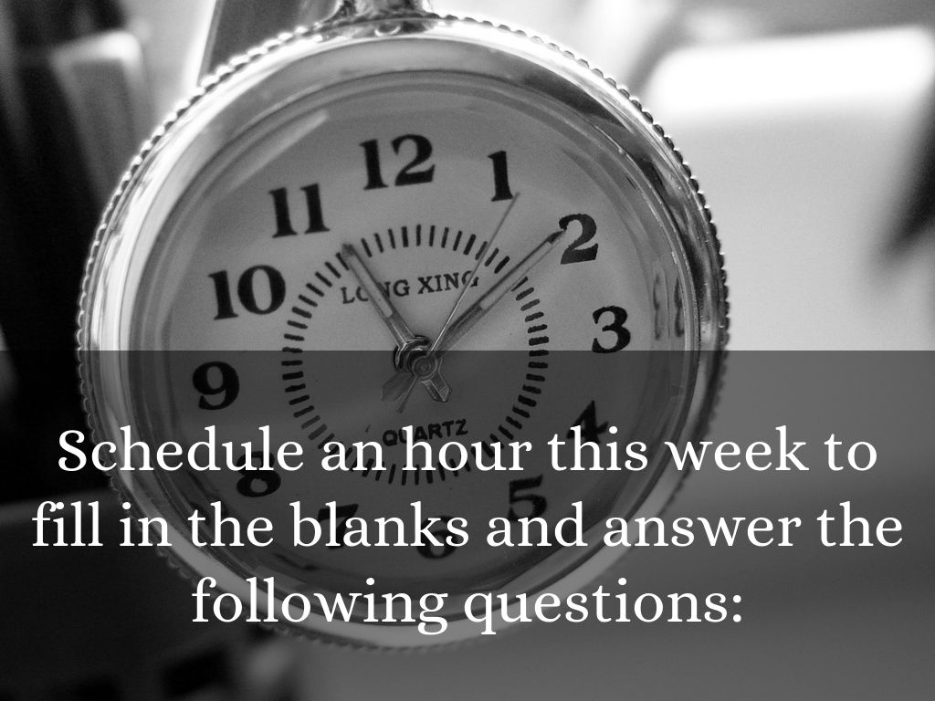 Schedule an hour this week to fill in the blanks and answer the following questions: