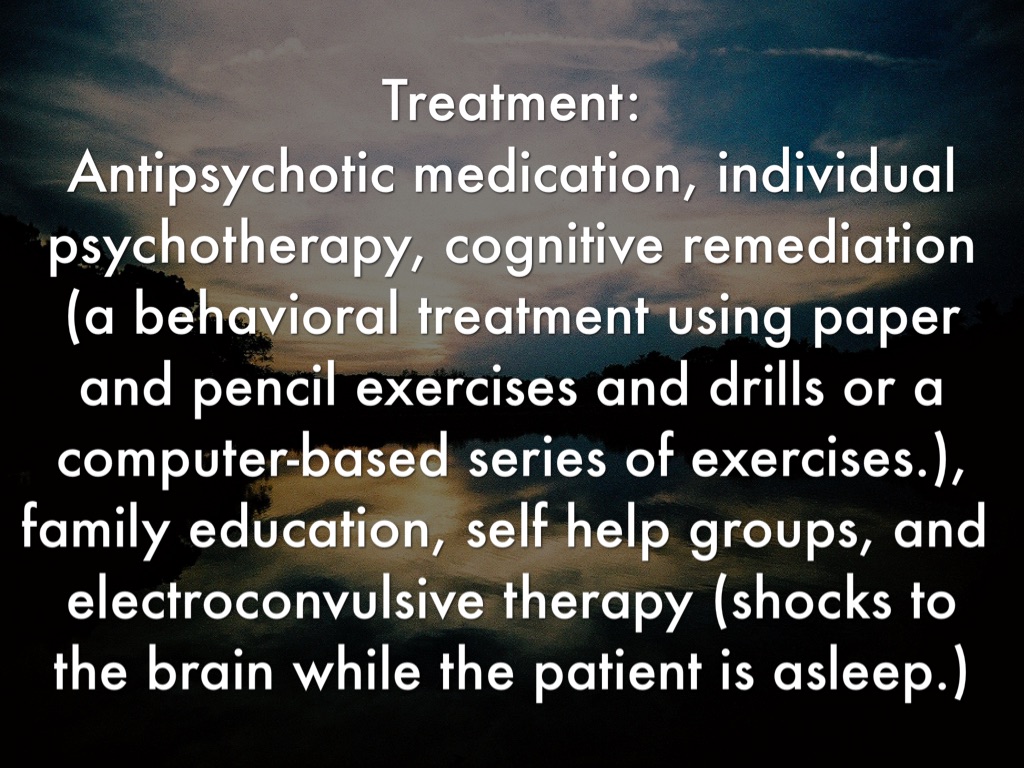 Treatment: Antipsychotic medication, individual psychotherapy, cognitive remediation (a behavioral treatment using paper and pencil exercises and drills or a computer-based series of exercises.), family education, self help groups, and electroconvulsive therapy (shocks to the brain while the patient is asleep.)
