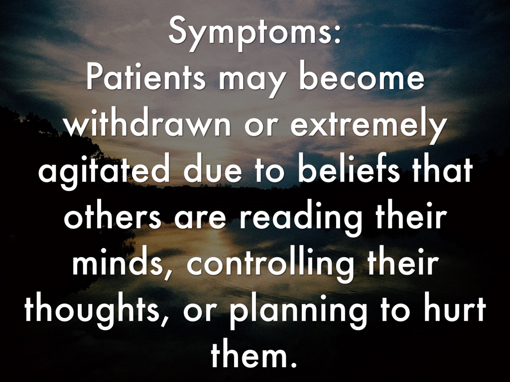 Symptoms: Patients may become withdrawn or extremely agitated due to beliefs that others are reading their minds, controlling their thoughts, or planning to hurt them.