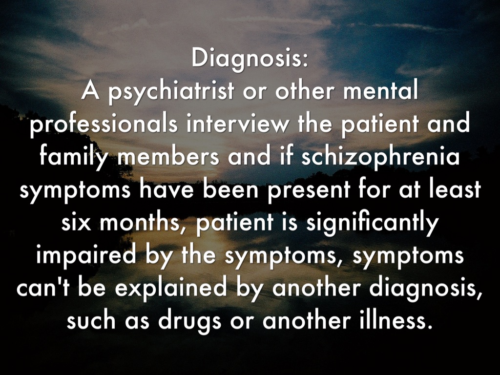 Diagnosis: A psychiatrist or other mental professionals interview the patient and family members and if schizophrenia symptoms have been present for at least six months, patient is significantly impaired by the symptoms, symptoms can't be explained by another diagnosis, such as drugs or another illness.