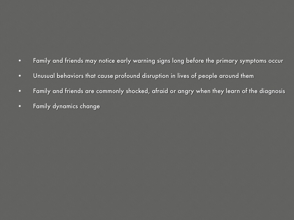 • Family and friends may notice early warning signs long before the primary symptoms occur
