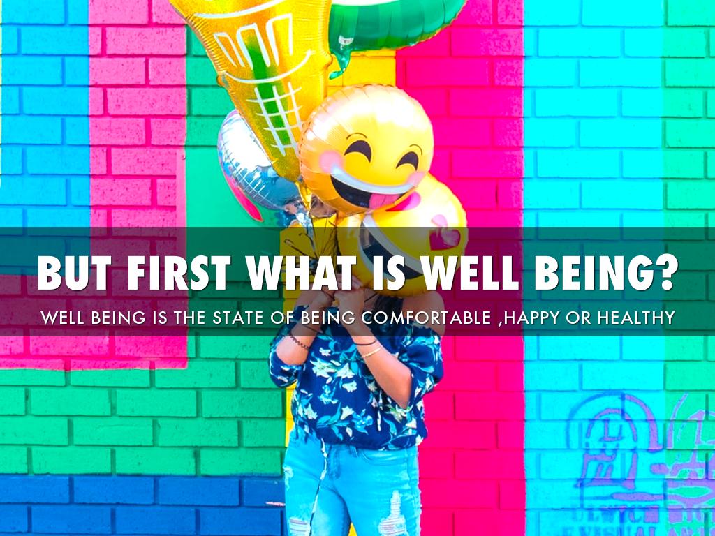 WELL BEING IS THE STATE OF BEING COMFORTABLE ,HAPPY OR HEALTHY