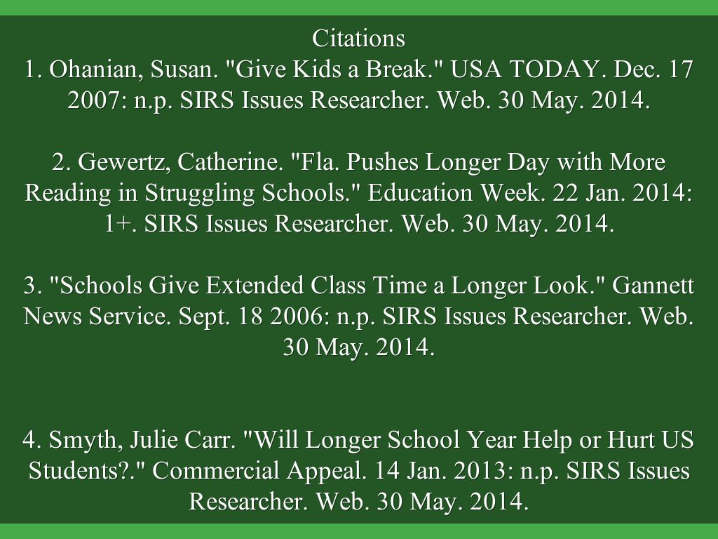 3. "Schools Give Extended Class Time a Longer Look." Gannett News Service. Sept. 18 2006: n.p. SIRS Issues Researcher. Web. 30 May. 2014.