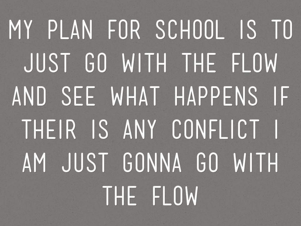 My plan for school is to just go with the flow and see what happens if their is any conflict i am just gonna go with the flow