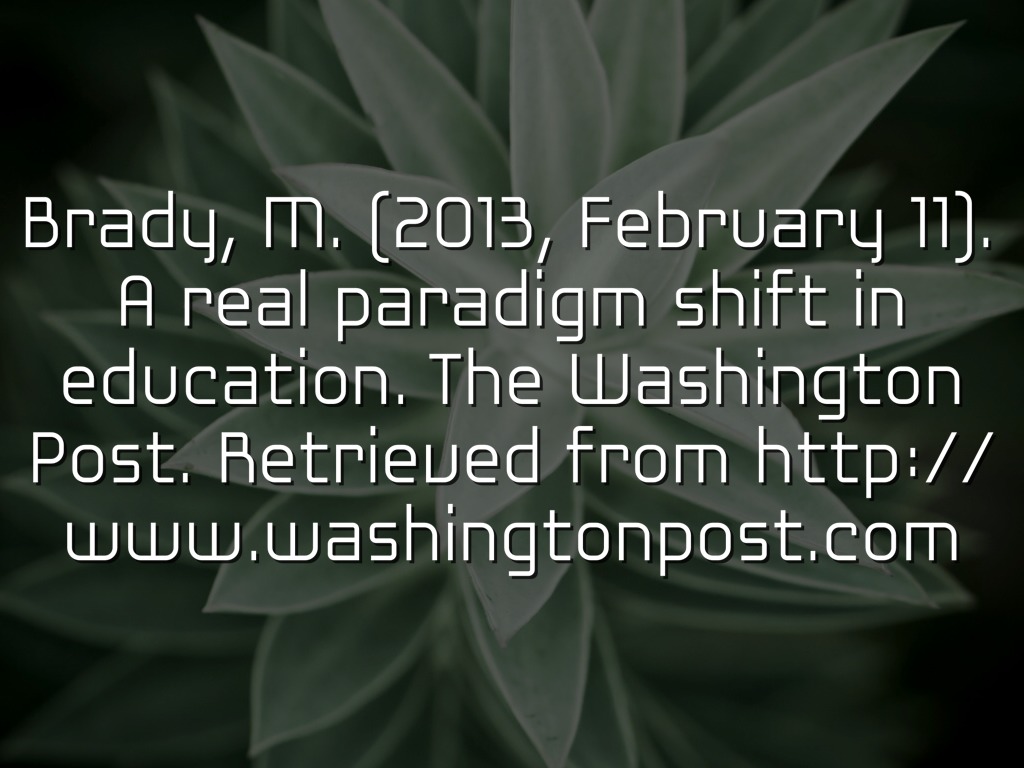 Brady, M. (2013, February 11). A real paradigm shift in education. The Washington Post. Retrieved from http://www.washingtonpost.com