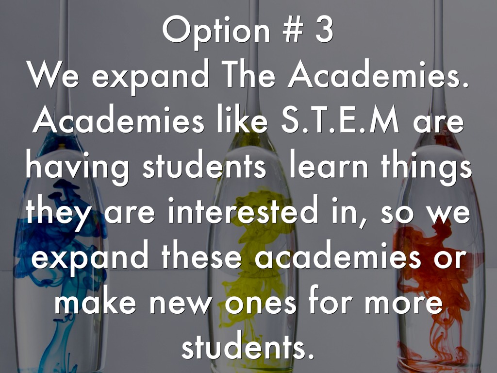 Option # 3 We expand The Academies. Academies like S.T.E.M are having students learn things they are interested in, so we expand these academies or make new ones for more students.