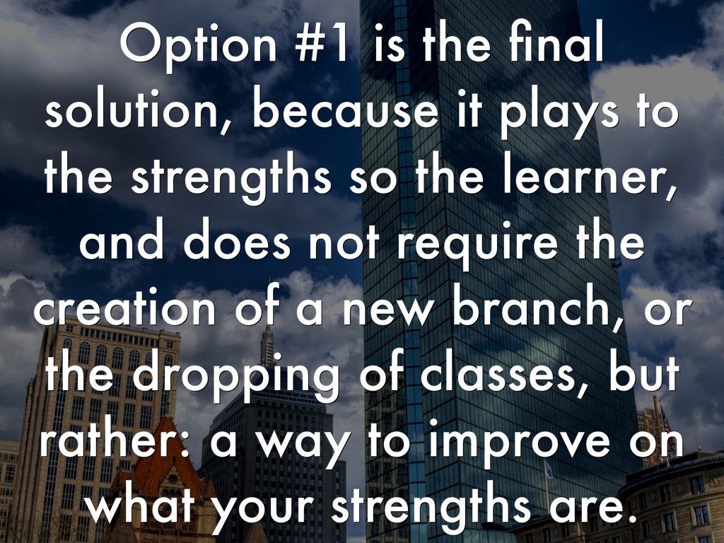 Option #1 is the final solution, because it plays to the strengths so the learner, and does not require the creation of a new branch, or the dropping of classes, but rather: a way to improve on what your strengths are.