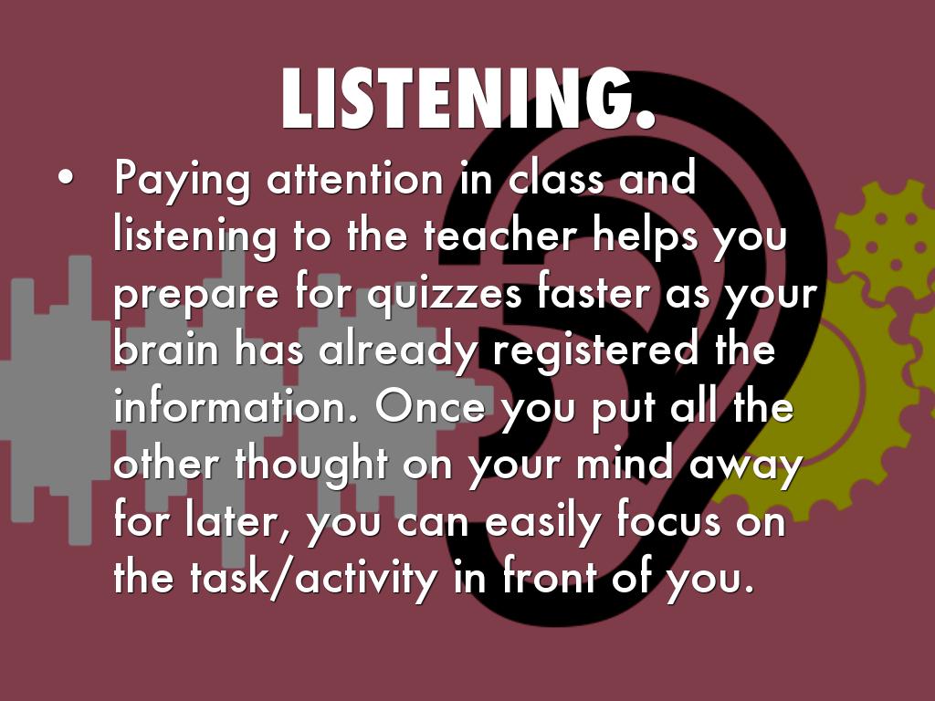 Paying attention in class and listening to the teacher helps you prepare for quizzes faster as your brain has already registered the information. Once you put all the other thought on your mind away for later, you can easily focus on the task/activity in front of you.