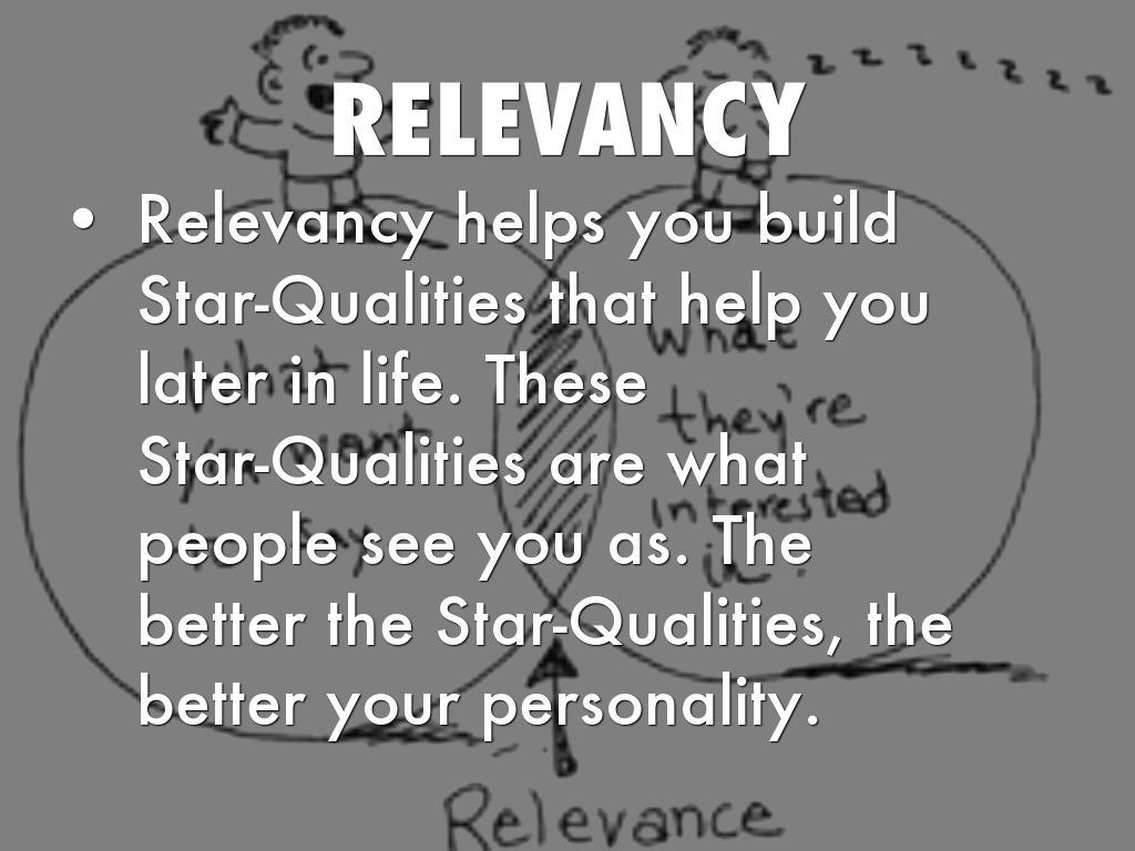 Relevancy helps you build Star-Qualities that help you later in life. These Star-Qualities are what people see you as. The better the Star-Qualities, the better your personality.