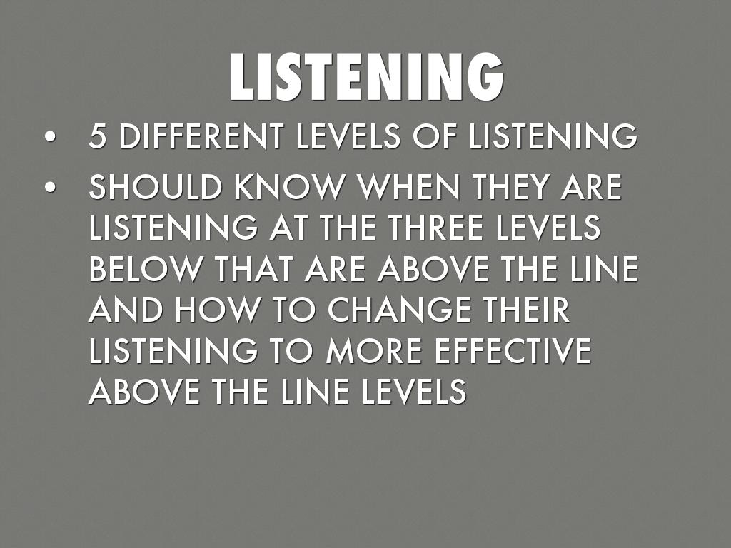 SHOULD KNOW WHEN THEY ARE LISTENING AT THE THREE LEVELS BELOW THAT ARE ABOVE THE LINE AND HOW TO CHANGE THEIR LISTENING TO MORE EFFECTIVE ABOVE THE LINE LEVELS