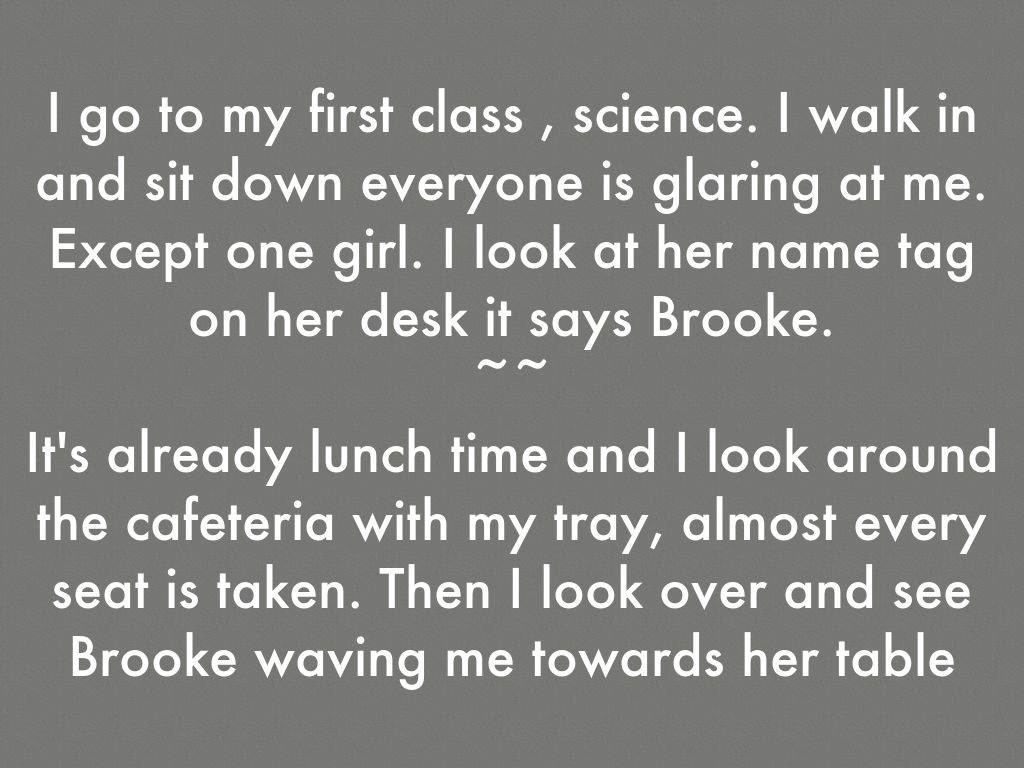 I go to my first class , science. I walk in and sit down everyone is glaring at me. Except one girl. I look at her name tag on her desk it says Brooke.