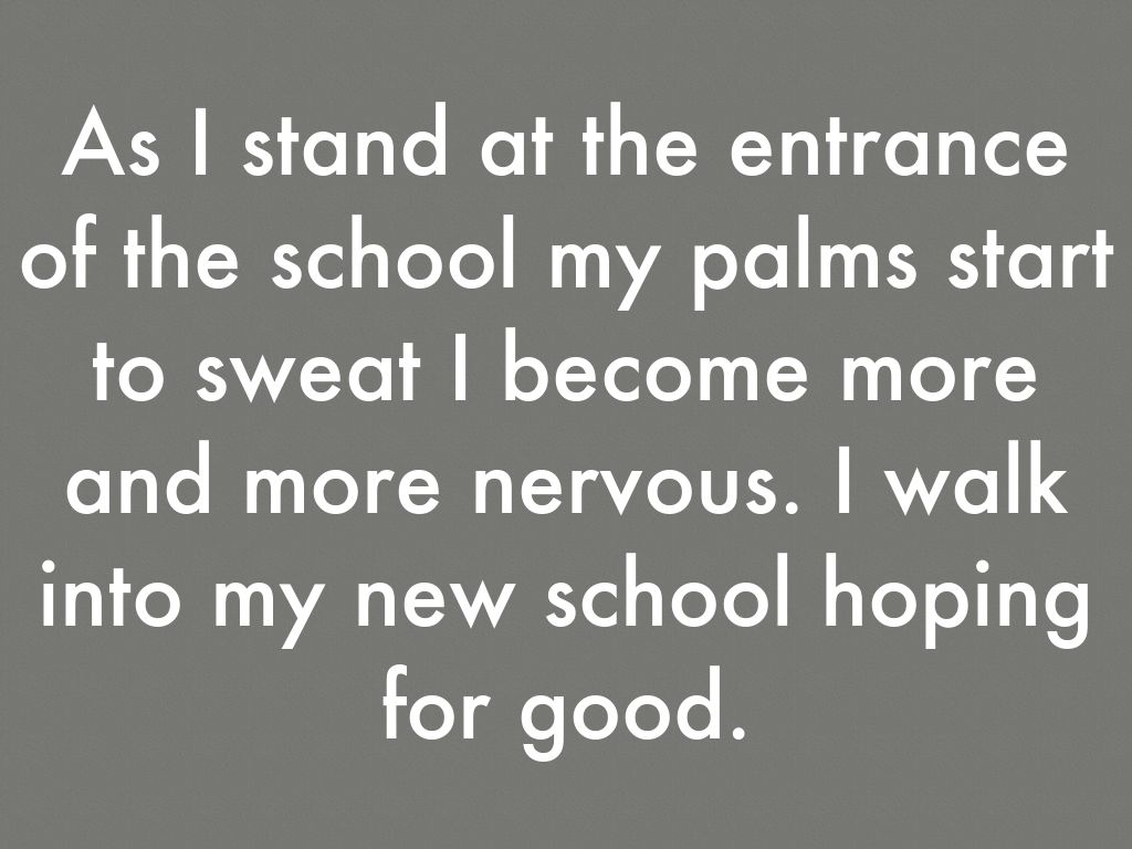 As I stand at the entrance of the school my palms start to sweat I become more and more nervous. I walk into my new school hoping for good.