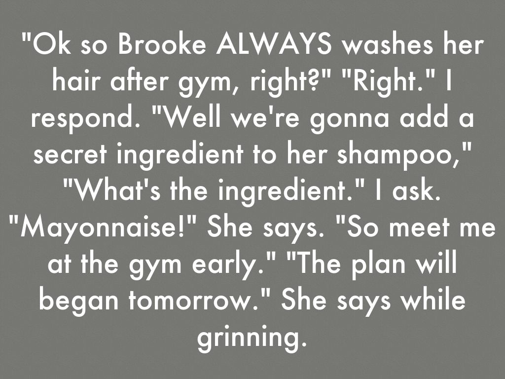 "Ok so Brooke ALWAYS washes her hair after gym, right?" "Right." I respond. "Well we're gonna add a secret ingredient to her shampoo," "What's the ingredient." I ask. "Mayonnaise!" She says. "So meet me at the gym early." "The plan will began tomorrow." She says while grinning.