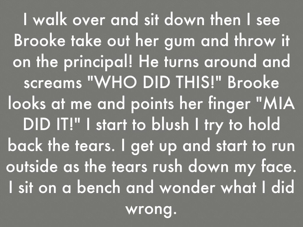 I walk over and sit down then I see Brooke take out her gum and throw it on the principal! He turns around and screams "WHO DID THIS!" Brooke looks at me and points her finger "MIA DID IT!" I start to blush I try to hold back the tears. I get up and start to run outside as the tears rush down my face. I sit on a bench and wonder what I did wrong.