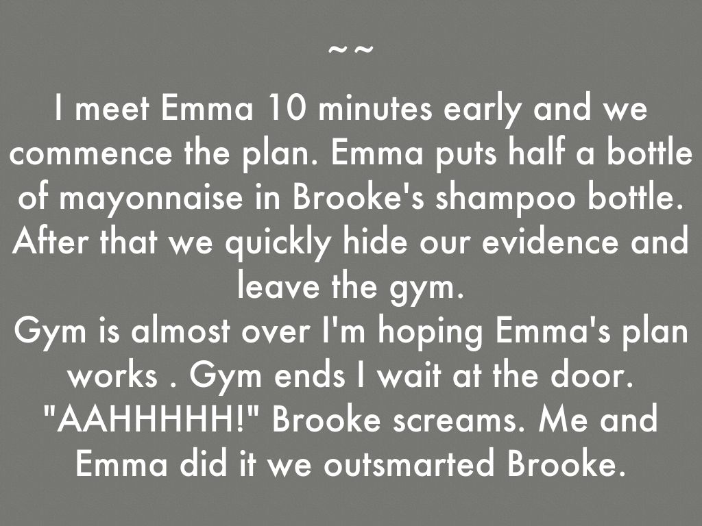 Gym is almost over I'm hoping Emma's plan works . Gym ends I wait at the door. "AAHHHHH!" Brooke screams. Me and Emma did it we outsmarted Brooke.