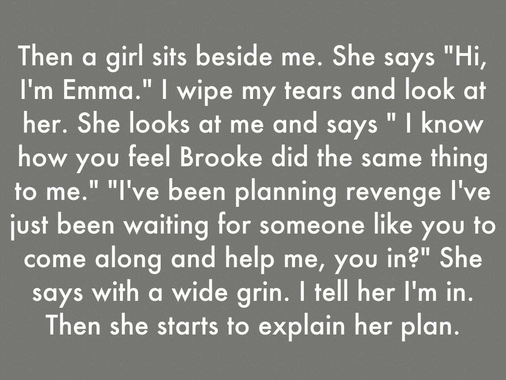 Then a girl sits beside me. She says "Hi, I'm Emma." I wipe my tears and look at her. She looks at me and says " I know how you feel Brooke did the same thing to me." "I've been planning revenge I've just been waiting for someone like you to come along and help me, you in?" She says with a wide grin. I tell her I'm in. Then she starts to explain her plan.