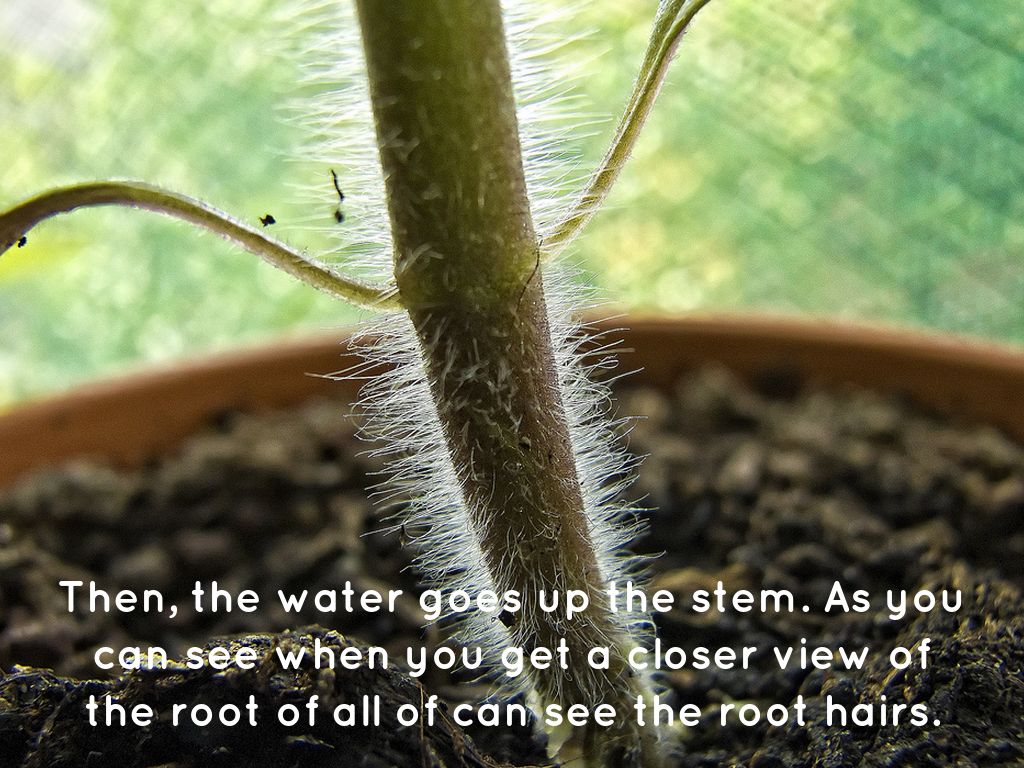 Then, the water goes up the stem. As you can see when you get a closer view of the root of all of can see the root hairs.