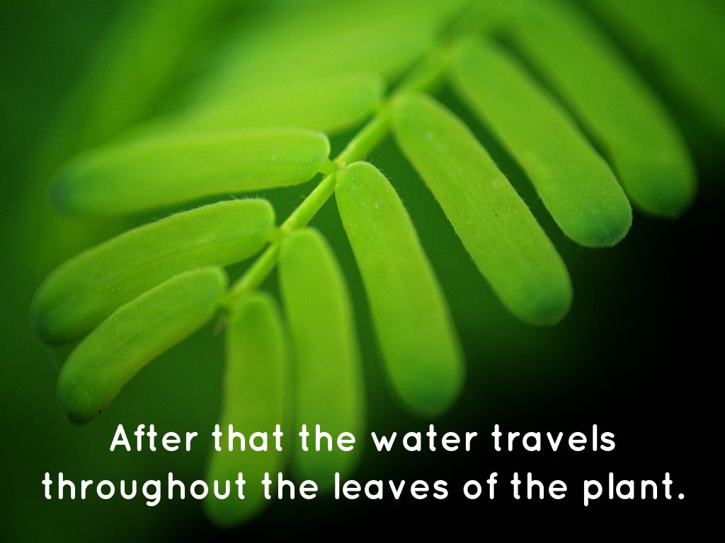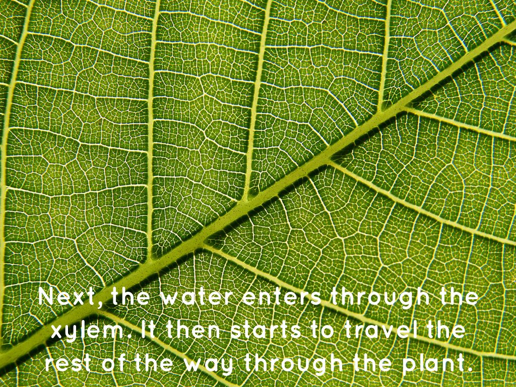 Next, the water enters through the xylem. It then starts to travel the rest of the way through the plant.