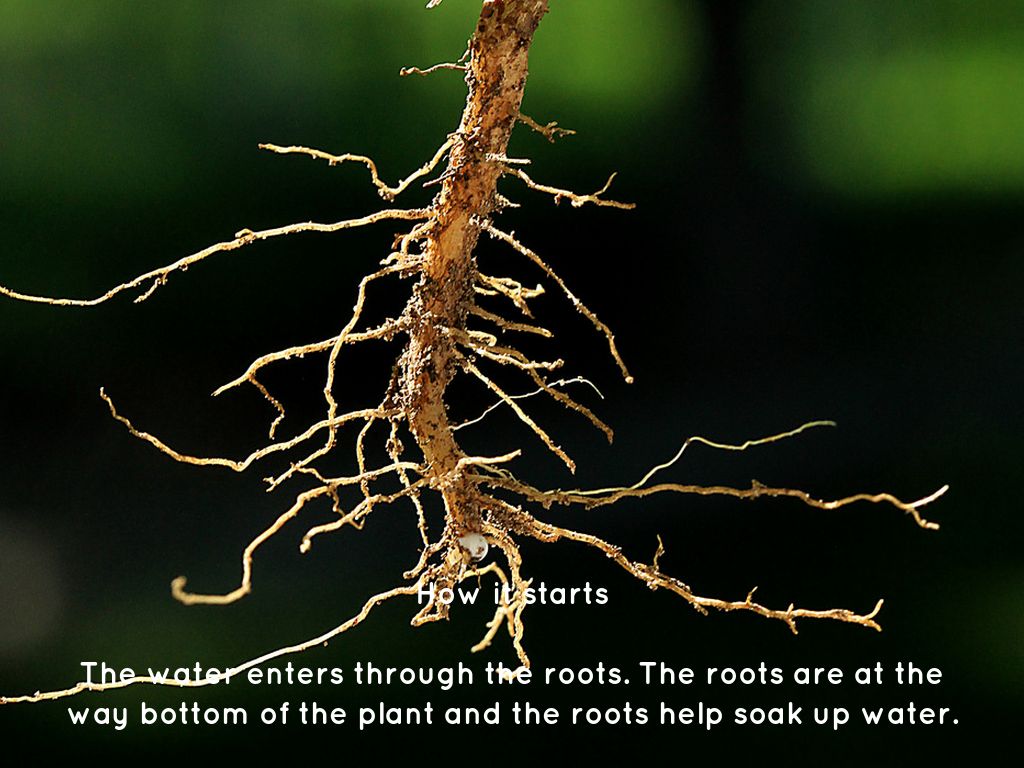 The water enters through the roots. The roots are at the way bottom of the plant and the roots help soak up water.