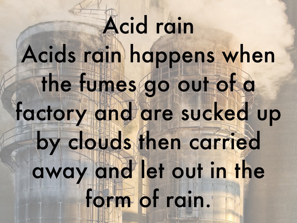 Acids rain happens when the fumes go out of a factory and are sucked up by clouds then carried away and let out in the form of rain.