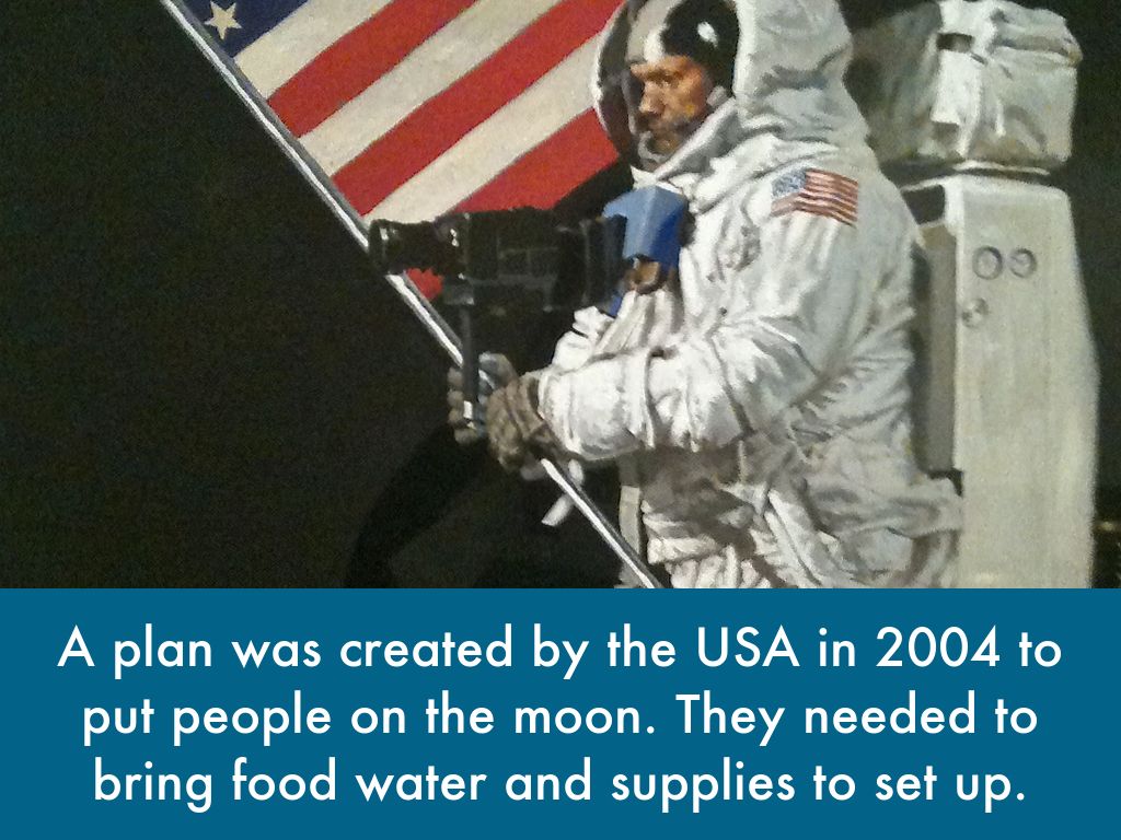 A plan was created by the USA in 2004 to put people on the moon. They needed to bring food water and supplies to set up.