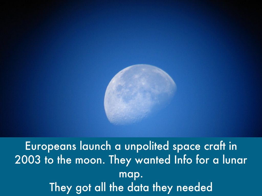 Europeans launch a unpolited space craft in 2003 to the moon. They wanted Info for a lunar map.