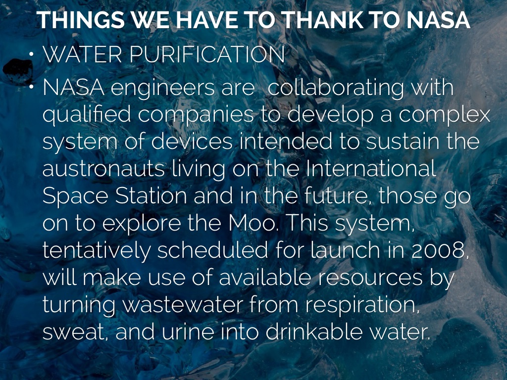NASA engineers are collaborating with qualified companies to develop a complex system of devices intended to sustain the austronauts living on the International Space Station and in the future, those go on to explore the Moo. This system, tentatively scheduled for launch in 2008, will make use of available resources by turning wastewater from respiration, sweat, and urine into drinkable water.