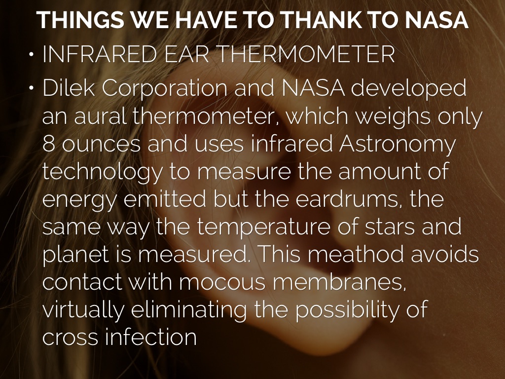 Dilek Corporation and NASA developed an aural thermometer, which weighs only 8 ounces and uses infrared Astronomy technology to measure the amount of energy emitted but the eardrums, the same way the temperature of stars and planet is measured. This meathod avoids contact with mocous membranes, virtually eliminating the possibility of cross infection
