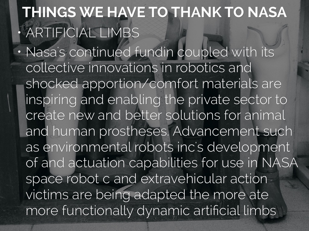 Nasa's continued fundin coupled with its collective innovations in robotics and shocked apportion/comfort materials are inspiring and enabling the private sector to create new and better solutions for animal and human prostheses. Advancement such as environmental robots inc's development of and actuation capabilities for use in NASA space robot c and extravehicular action victims are being adapted the more ate more functionally dynamic artificial limbs