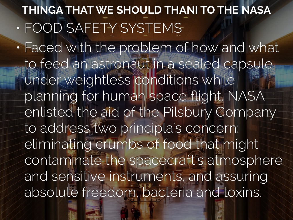 Faced with the problem of how and what to feed an astronaut in a sealed capsule under weightless conditions while planning for human space flight, NASA enlisted the aid of the Pilsbury Company to address two principla's concern: eliminating crumbs of food that might contaminate the spacecraft's atmosphere and sensitive instruments, and assuring absolute freedom, bacteria and toxins.
