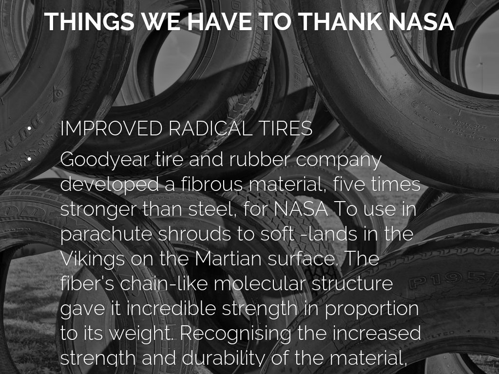 Goodyear tire and rubber company developed a fibrous material, five times stronger than steel, for NASA To use in parachute shrouds to soft -lands in the Vikings on the Martian surface. The fiber's chain-like molecular structure gave it incredible strength in proportion to its weight. Recognising the increased strength and durability of the material, Goodyear expected added the technology and went on to produce a new radical tire with tread life expected to be 10,000 miles greater than conventional radials.