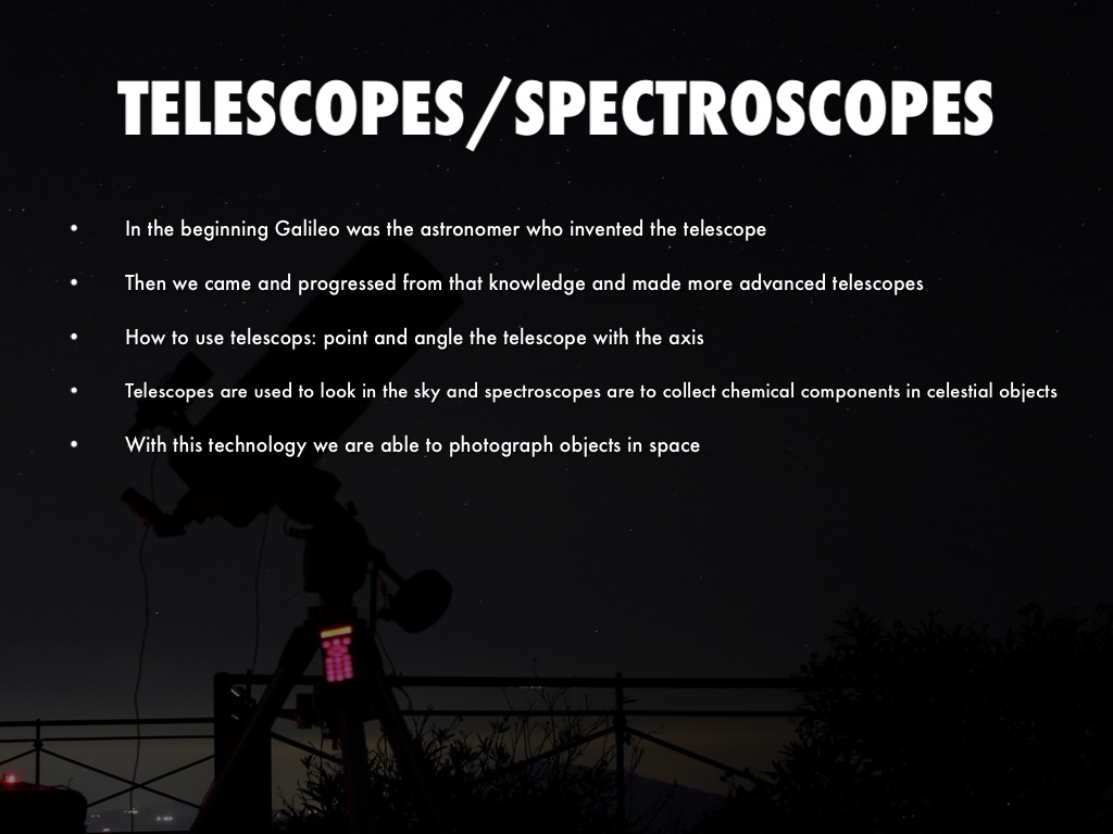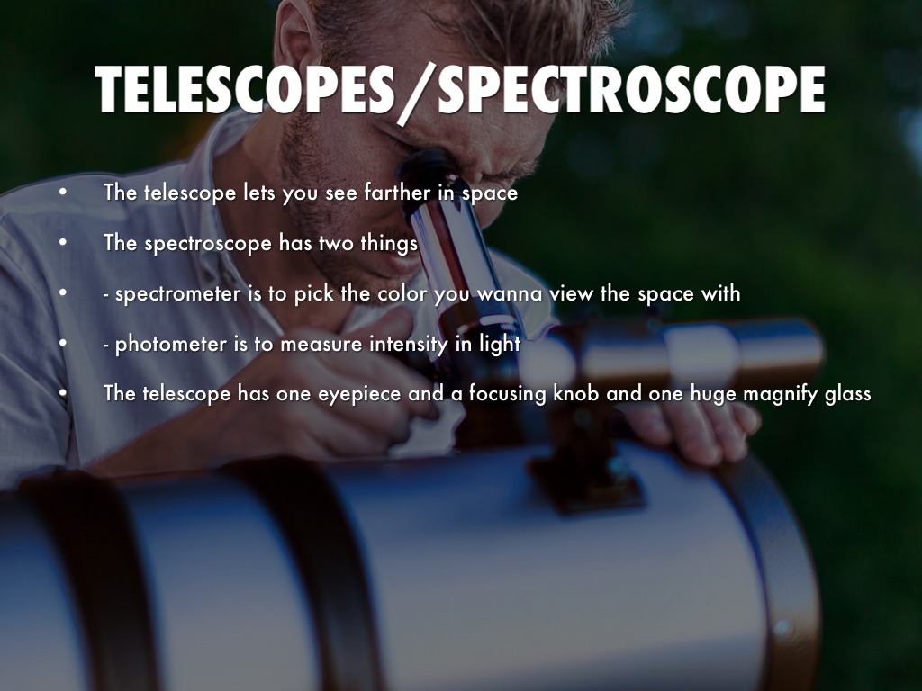Telescopes are used to look in the sky and spectroscopes are to collect chemical components in celestial objects
