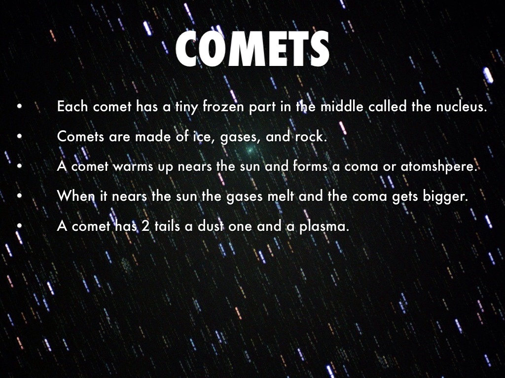 Each comet has a tiny frozen part in the middle called the nucleus.