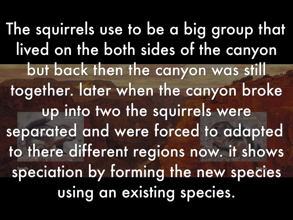 The squirrels use to be a big group that lived on the both sides of the canyon but back then the canyon was still together. later when the canyon broke up into two the squirrels were separated and were forced to adapted to there different regions now. it shows speciation by forming the new species using an existing species.