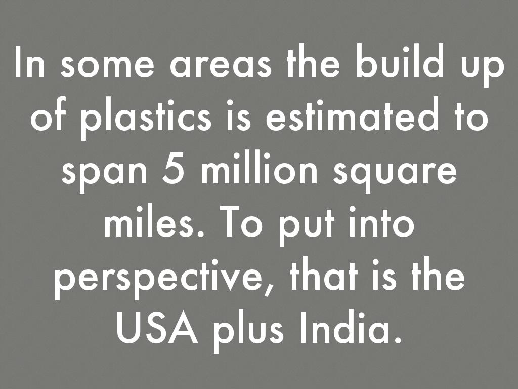 In some areas the build up of plastics is estimated to span 5 million square miles. To put into perspective, that is the USA plus India.